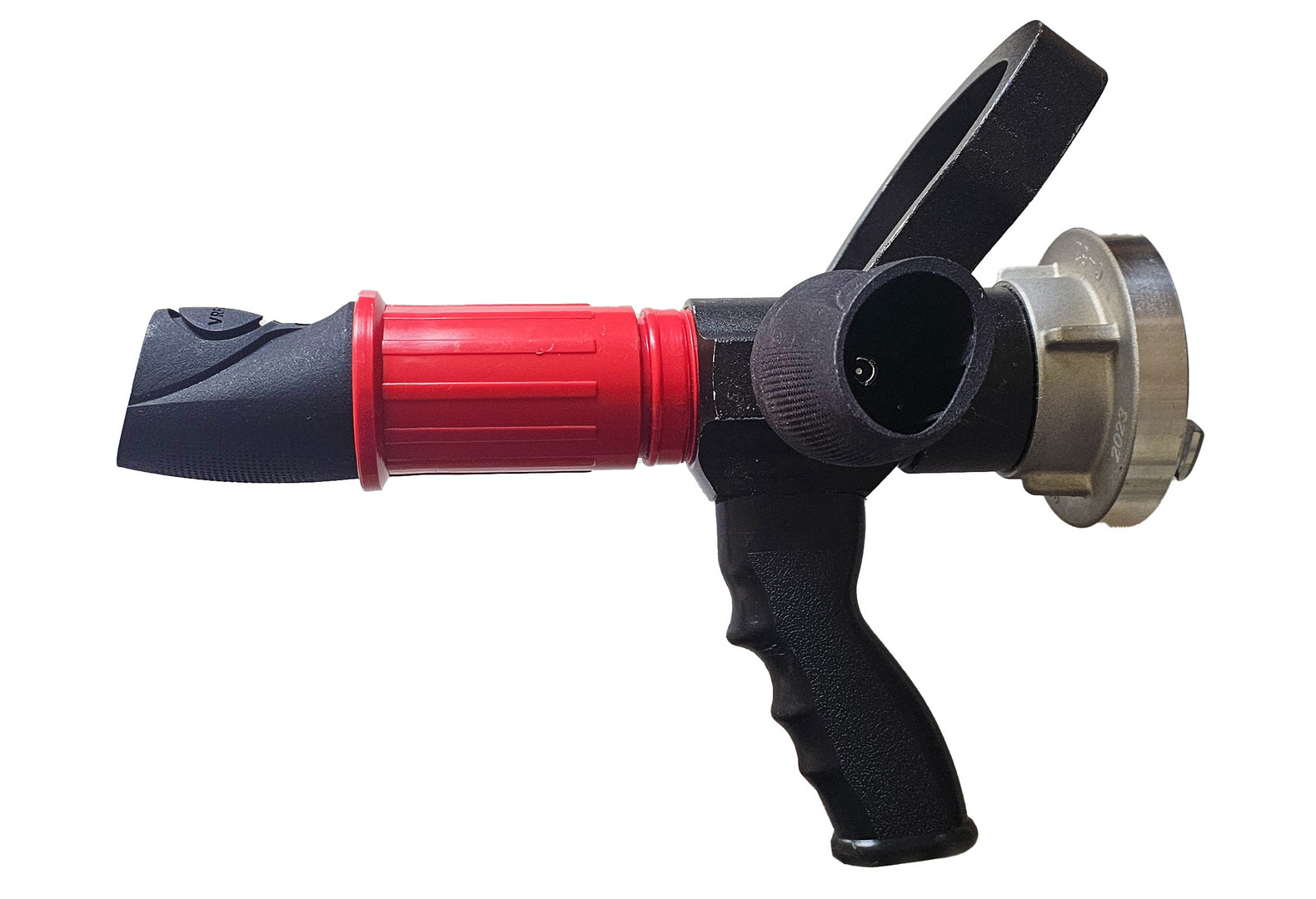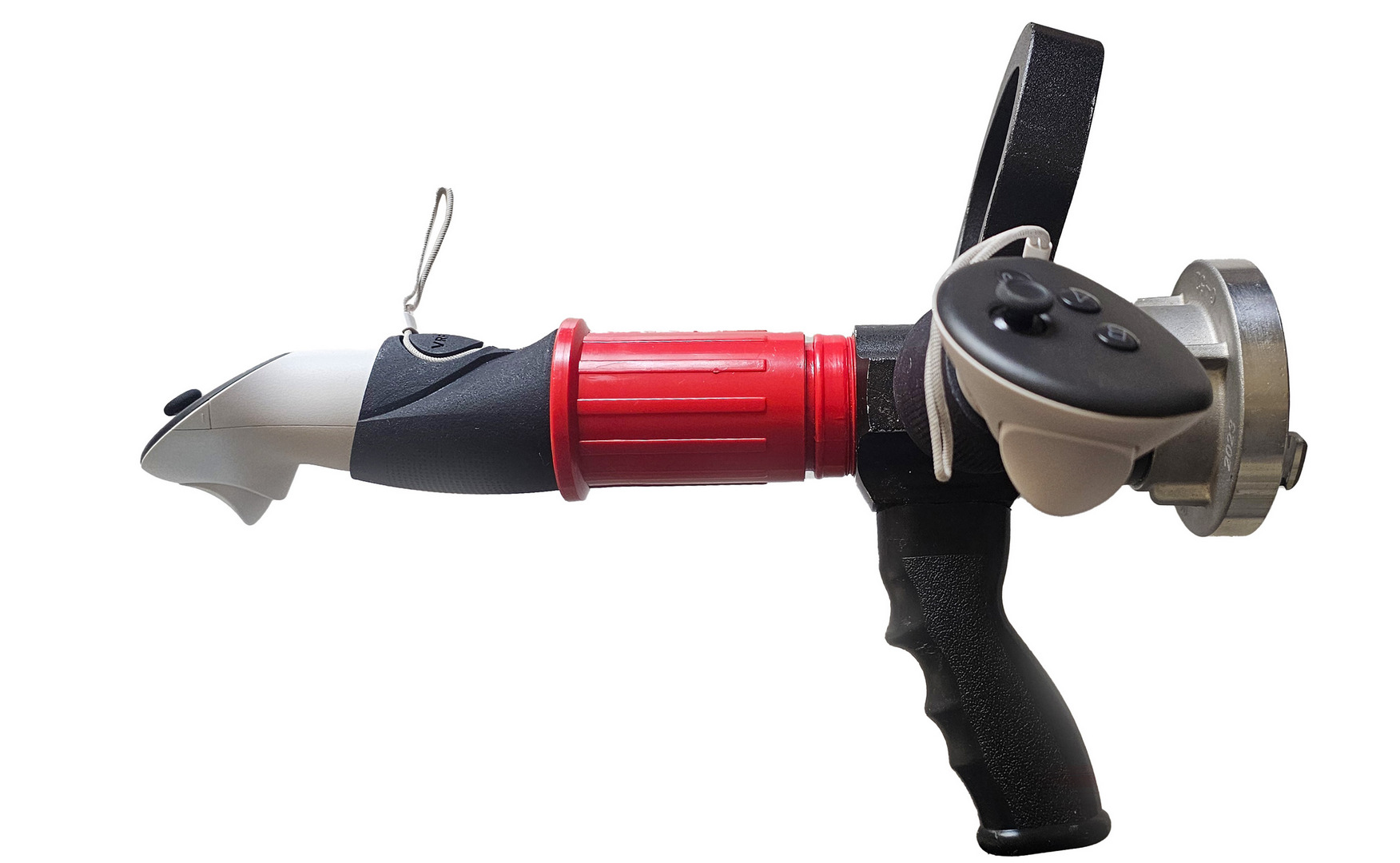 3D proudnice určená pro výcvik ve virtuální realitě v prostředí VR FOK.Proudnice je speciálně navržena pro použití se systémem virtuální reality Meta Quest 3. Součástí jsou držáky na ovladače vyrobené technologií 3D tisku, které zajišťují jejich pevné uchycení a přesnou polohu během používání. Držák v přední části proudnice je určen pro levý ovladač, boční držák pak pro pravý ovladač.